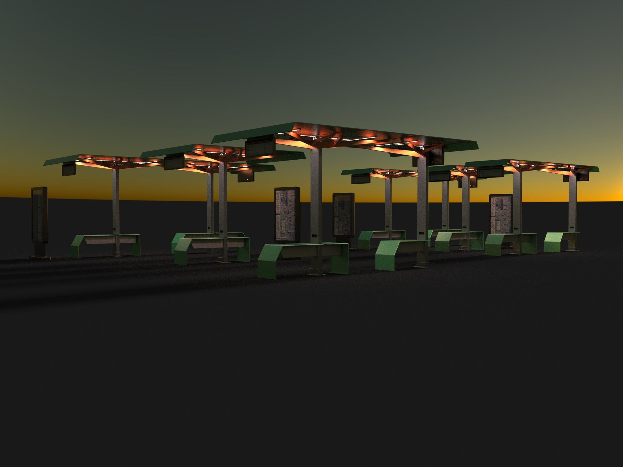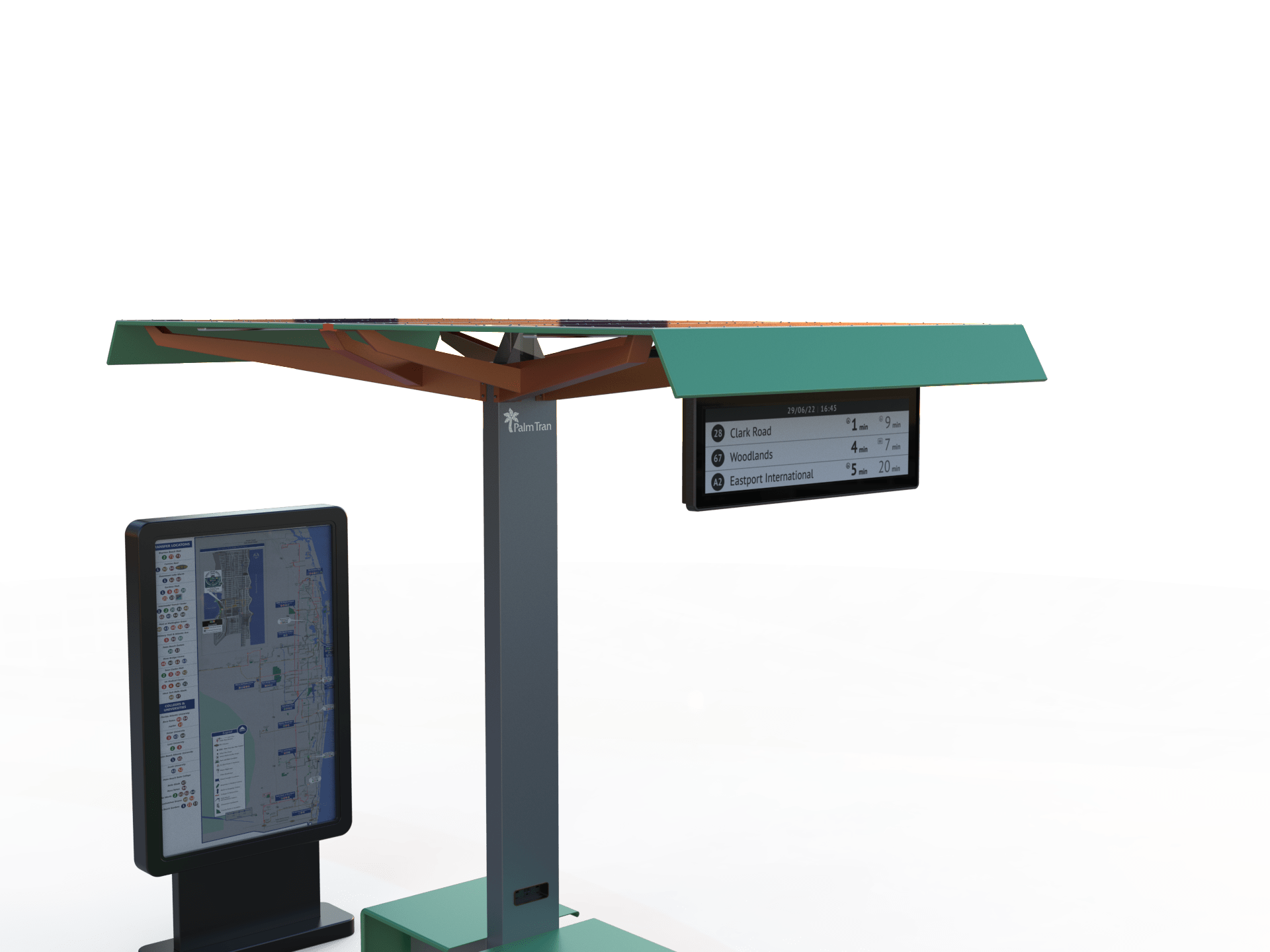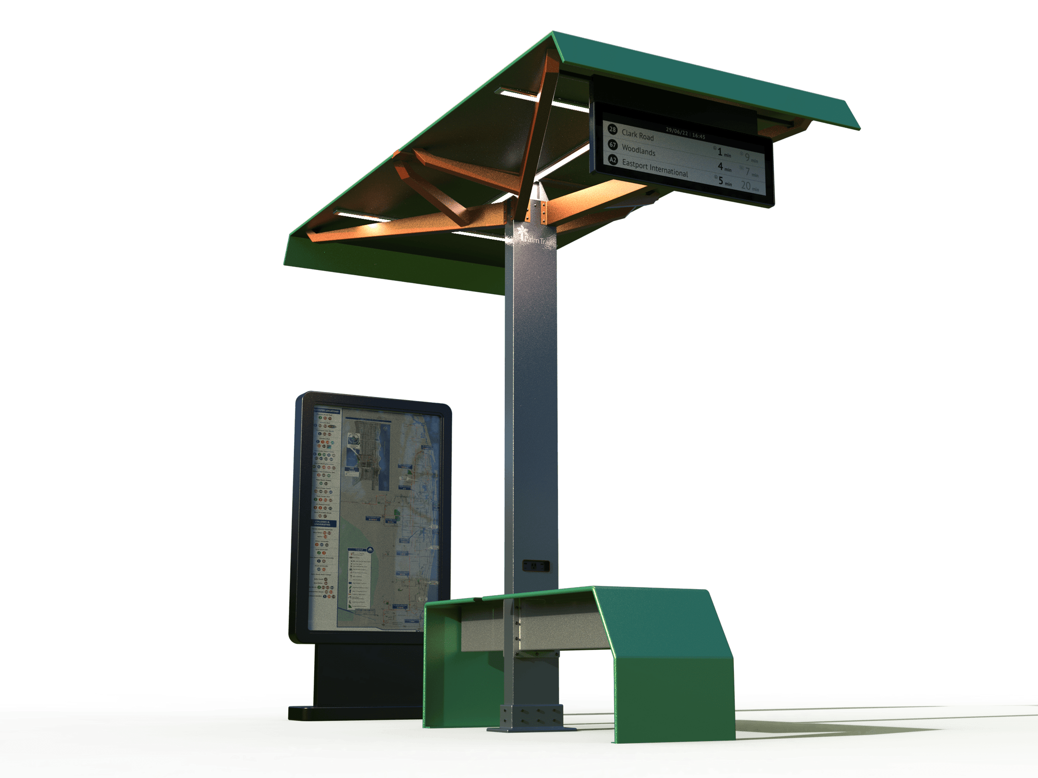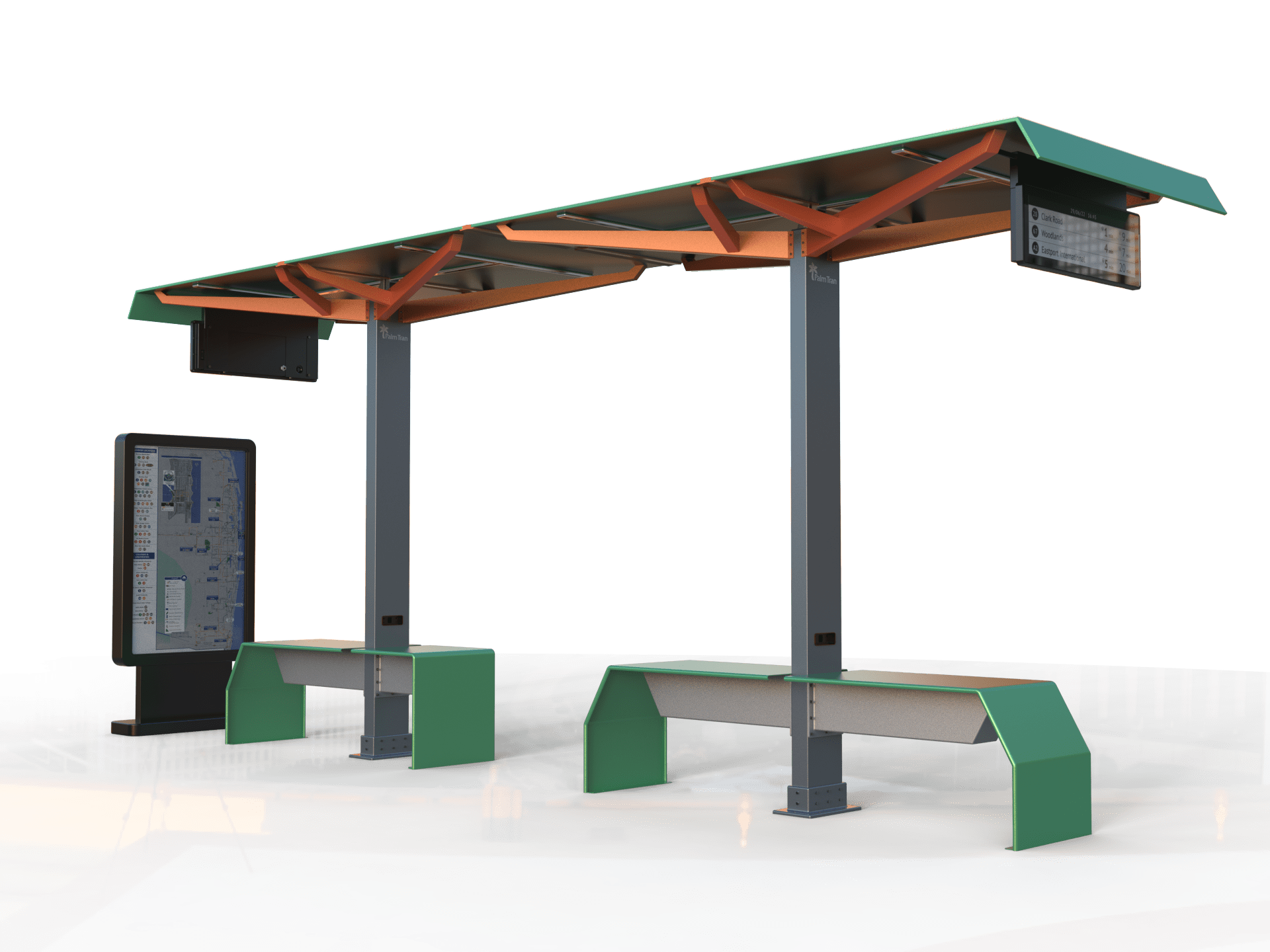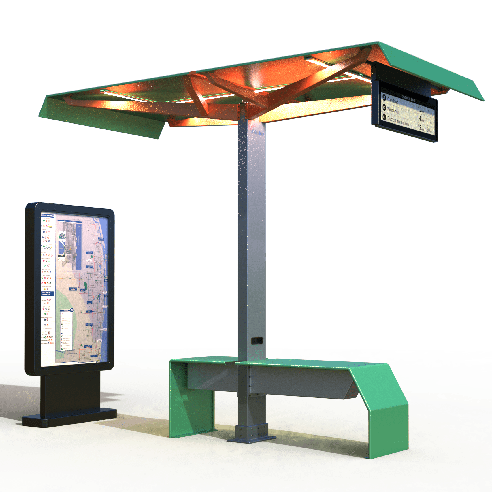 Function: Solar Light, shading seating, and a personal device charging system for bus stops, train stations, and light rails. Live transit information updates keep riders on time.