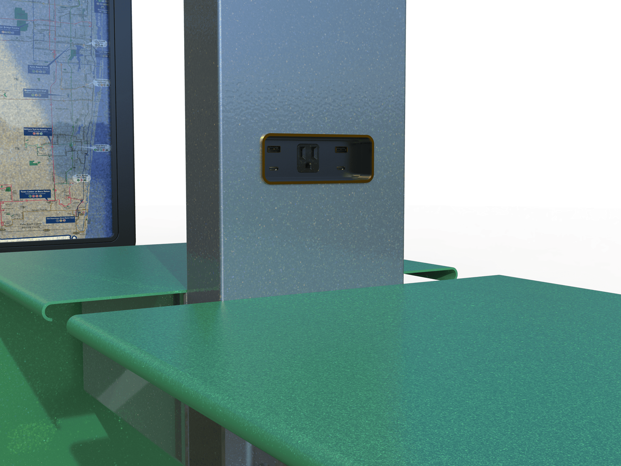 Options: ADA Compliant bench seating, personal charging stations, advertisement displays, live transit information system.